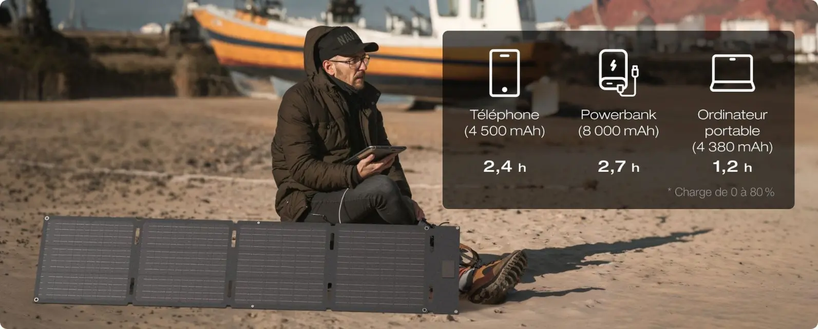 Avec sa conception compacte et son poids léger, le Panneau solaire portable EcoFlow 60 W s'associe parfaitement aux batteries solaires de la gamme RIVER, vous offrant une expérience de charge simple et efficace.