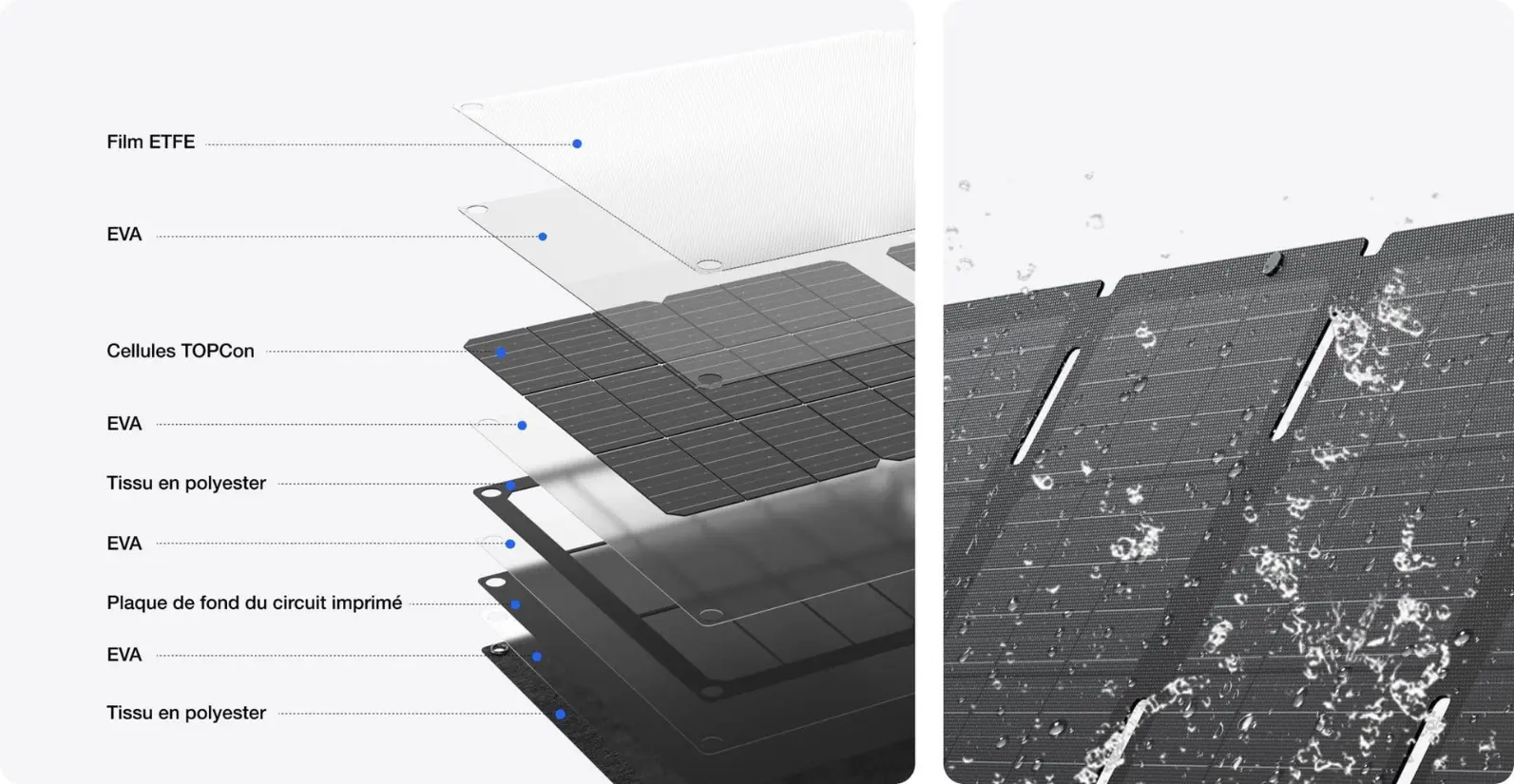 Doté de circuits imprimés robustes en fibre de verre et d'un revêtement durable en ETFE, le Panneau solaire portable EcoFlow 60 W est conçu pour résister aux conditions météorologiques difficiles. Qu'il s'agisse de chocs imprévus, de rafales de vent puissantes ou d'une exposition continue aux embruns marins et à l'humidité, il reste intact et performant, vous offrant une source d'énergie fiable pour toutes vos aventures en plein air.