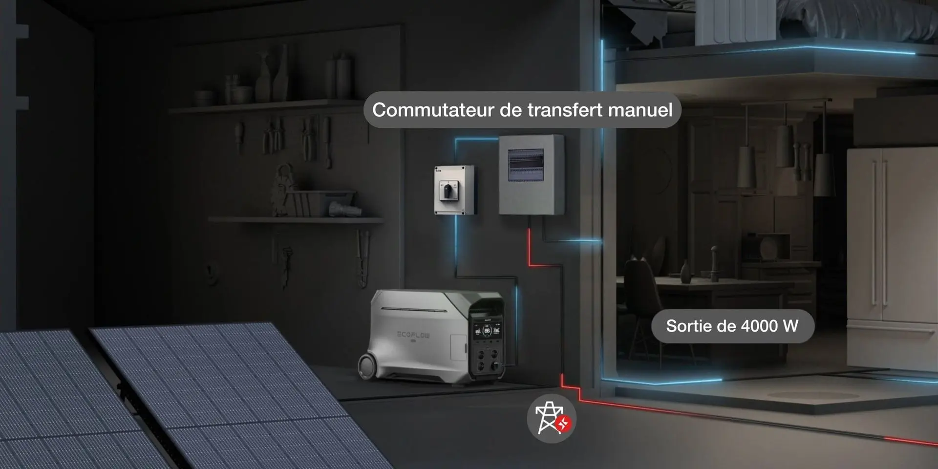 Le commutateur de transfert manuel⁷ vous permet de passer facilement de l'alimentation réseau à une station électrique portable à tout moment.
