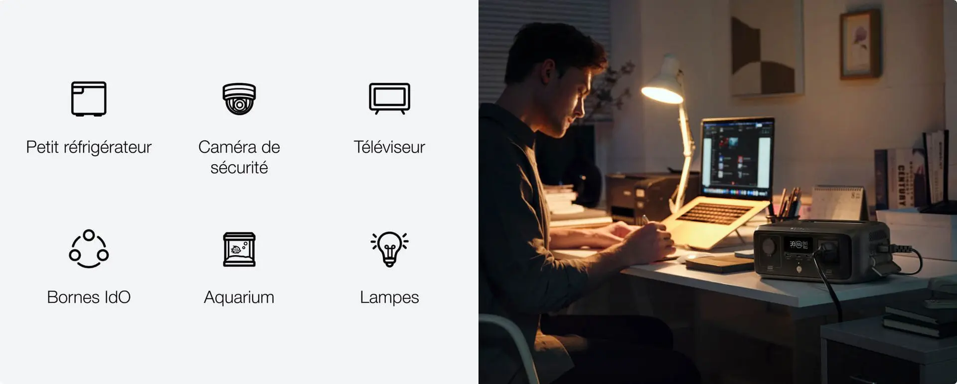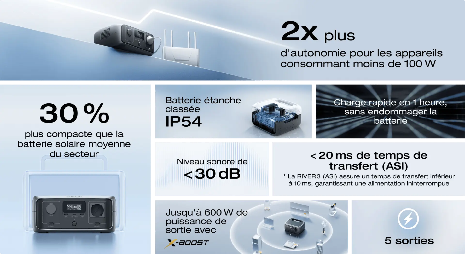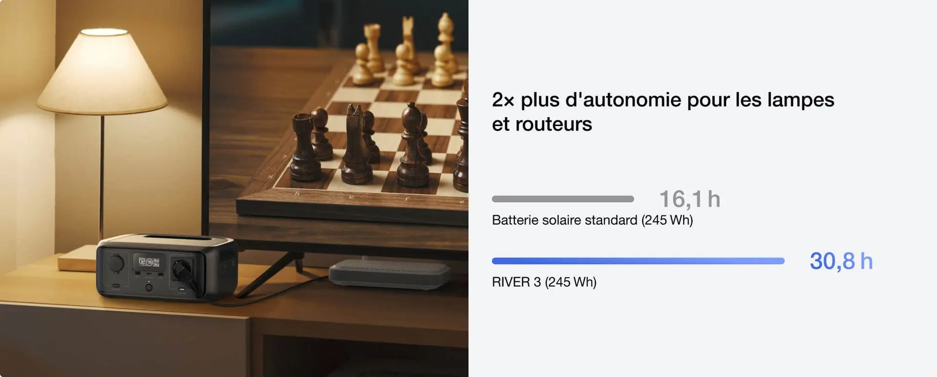 La RIVER 3 révolutionne l'efficacité énergétique en offrant une autonomie doublée¹ pour les appareils consommant moins de 100 W, permettant ainsi leur utilisation prolongée aussi bien à la maison qu'en plein air.¹