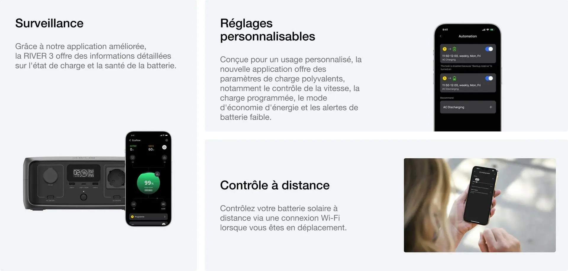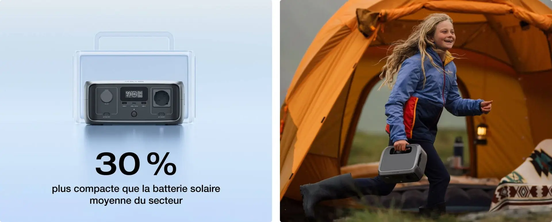 La technologie utilisée permet de minimiser les pertes de chaleur pendant le fonctionnement de la batterie, réduisant ainsi l'espace requis pour son refroidissement. Cela a permis de concevoir la RIVER 3 dans un format ultra-compact. Elle s'adapte facilement à des espaces réduits comme les placards, les fourgonnettes ou les sacs, facilitant ainsi le rangement et le transport.