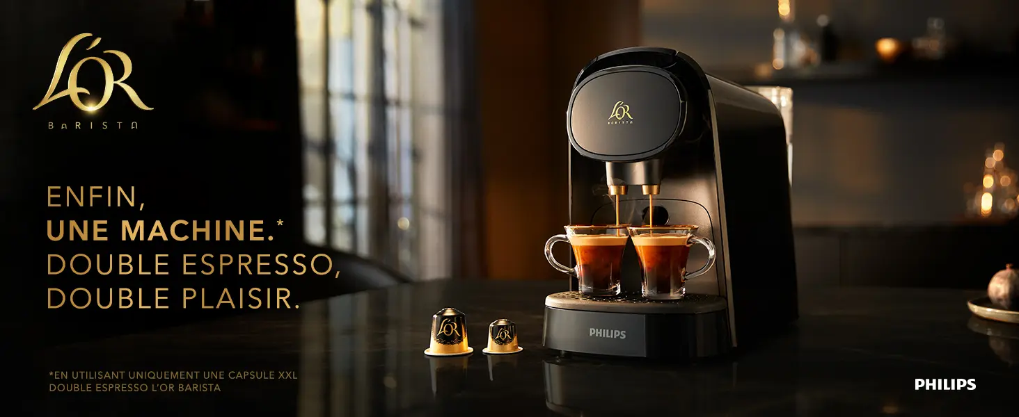 Double Espresso, double plaisir. La première machine à café à capsules doubles (XXL). Découvrez la nouvelle machine à café L'OR Barista. Prenez deux fois plus de plaisir en préparant deux espressos simples ou un double espresso dans unse tasse, grâce au système exclusif double L'OR Barista.