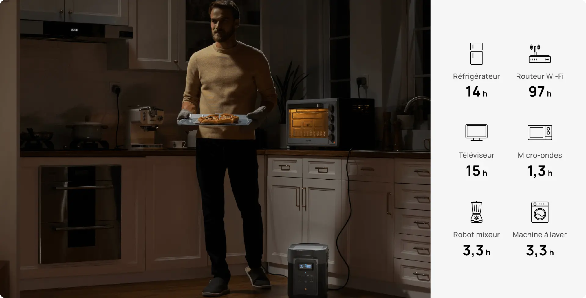 Alimentez presque tous vos appareils avec une puissance de sortie allant jusqu’à 3100 W.